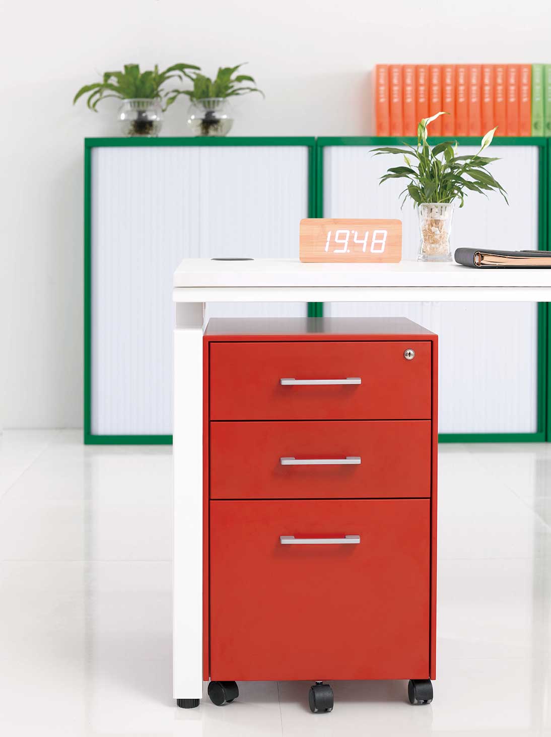 Personal metal storage range includes desk side storage towers & mobile office pedestals. Part of the slim steel storage range.